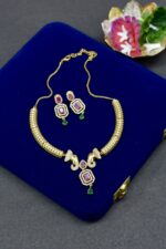 Featuring traditional elephant motifs, this Temple Necklace Set reflects cultural richness with a premium handcrafted finish. The gold-tone detailing and stone embellishments give it a regal presence, making it ideal for weddings, traditional events, and festive celebrations while offering excellent value.