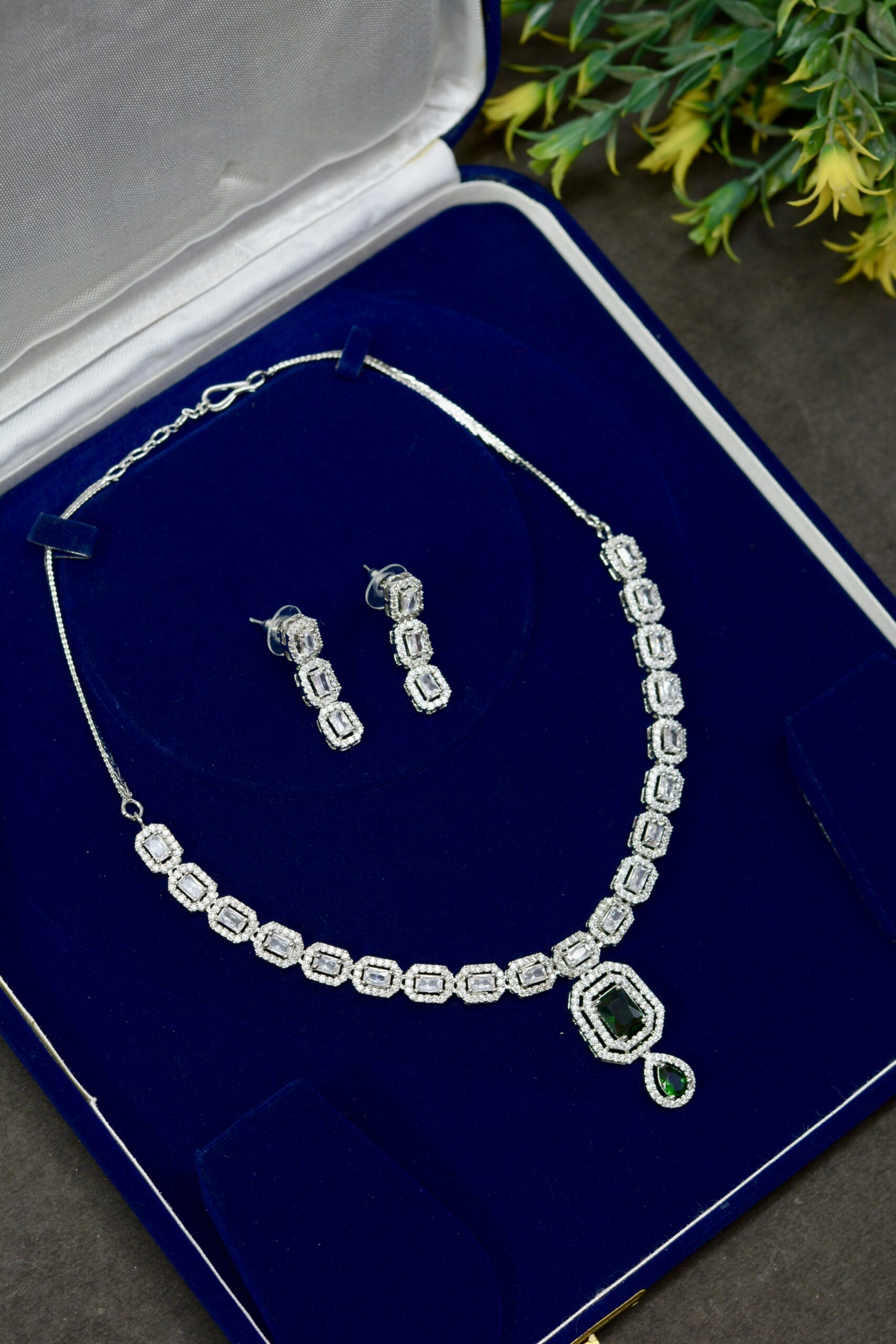 This Emerald Square Drop Necklace Set showcases precision-cut square stones accented with delicate crystal framing. The modern yet elegant design enhances its premium appeal, making it a versatile choice for celebrations, evening wear, and gifting while remaining lightweight and affordable.