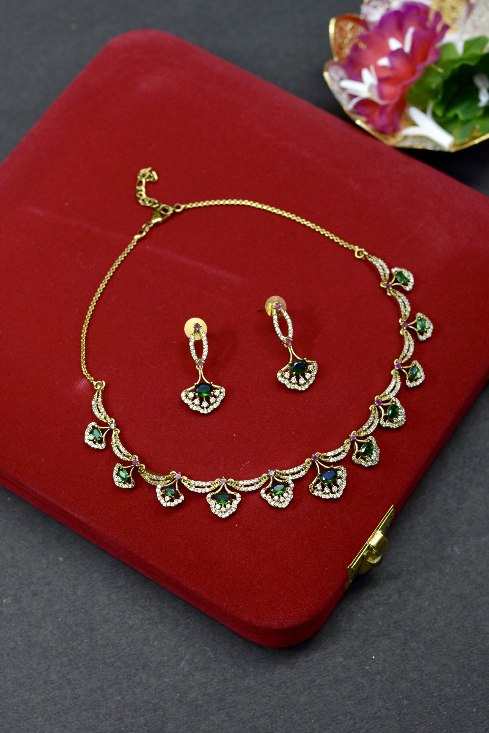 This Green Drop Traditional Necklace Set highlights vibrant green stones paired with elegant gold-tone detailing. Designed for classic appeal, it delivers a luxurious festive look with graceful movement, making it perfect for traditional outfits, ceremonies, and special occasions at a comfortable price range.