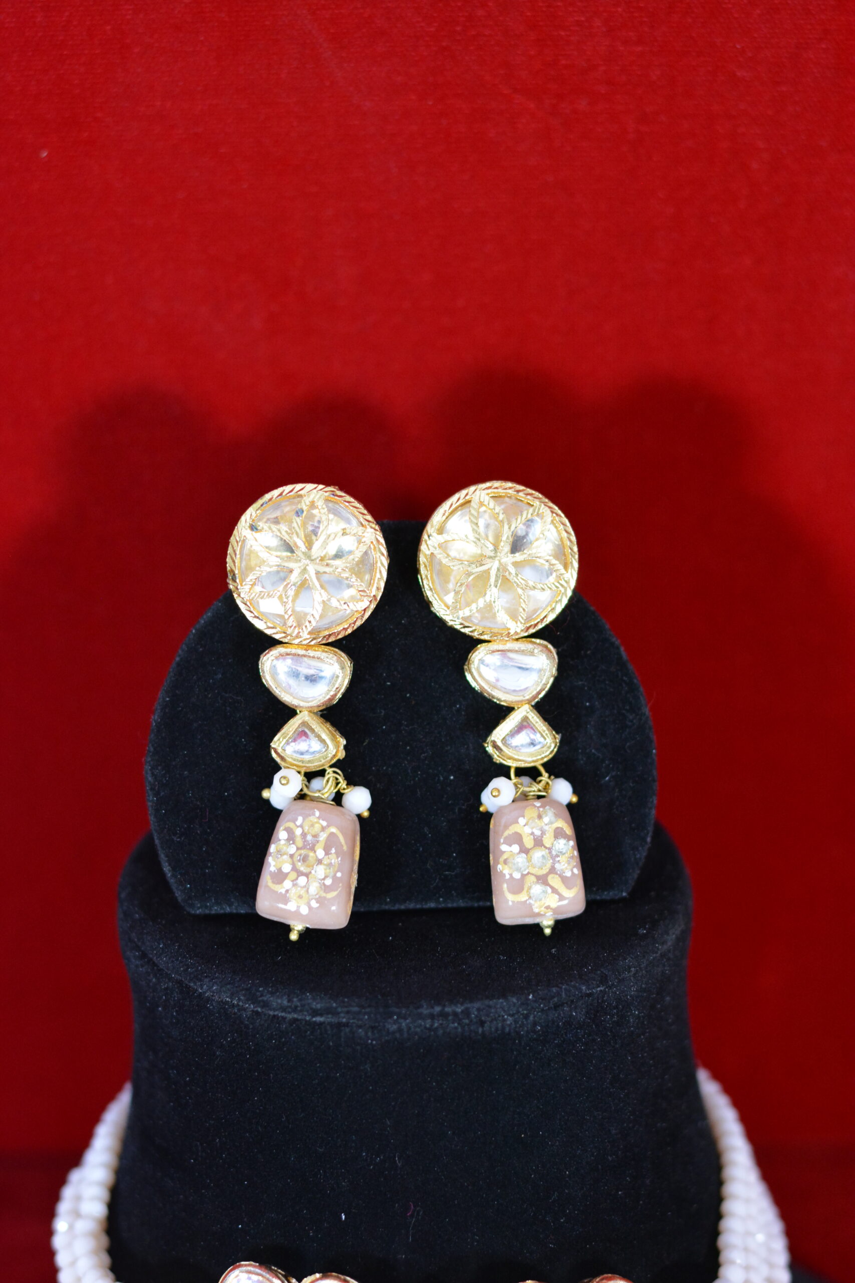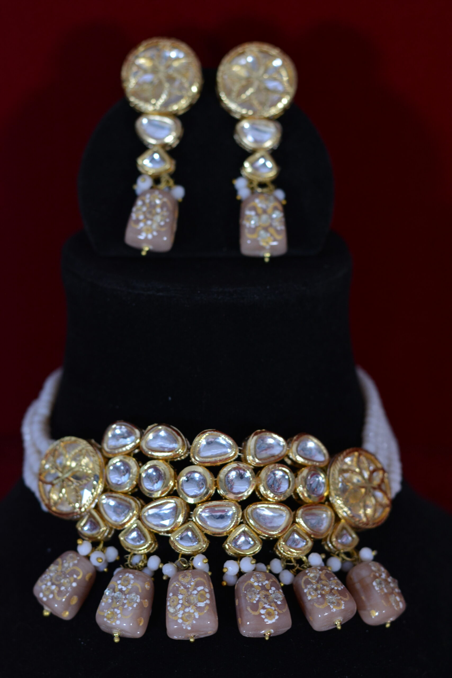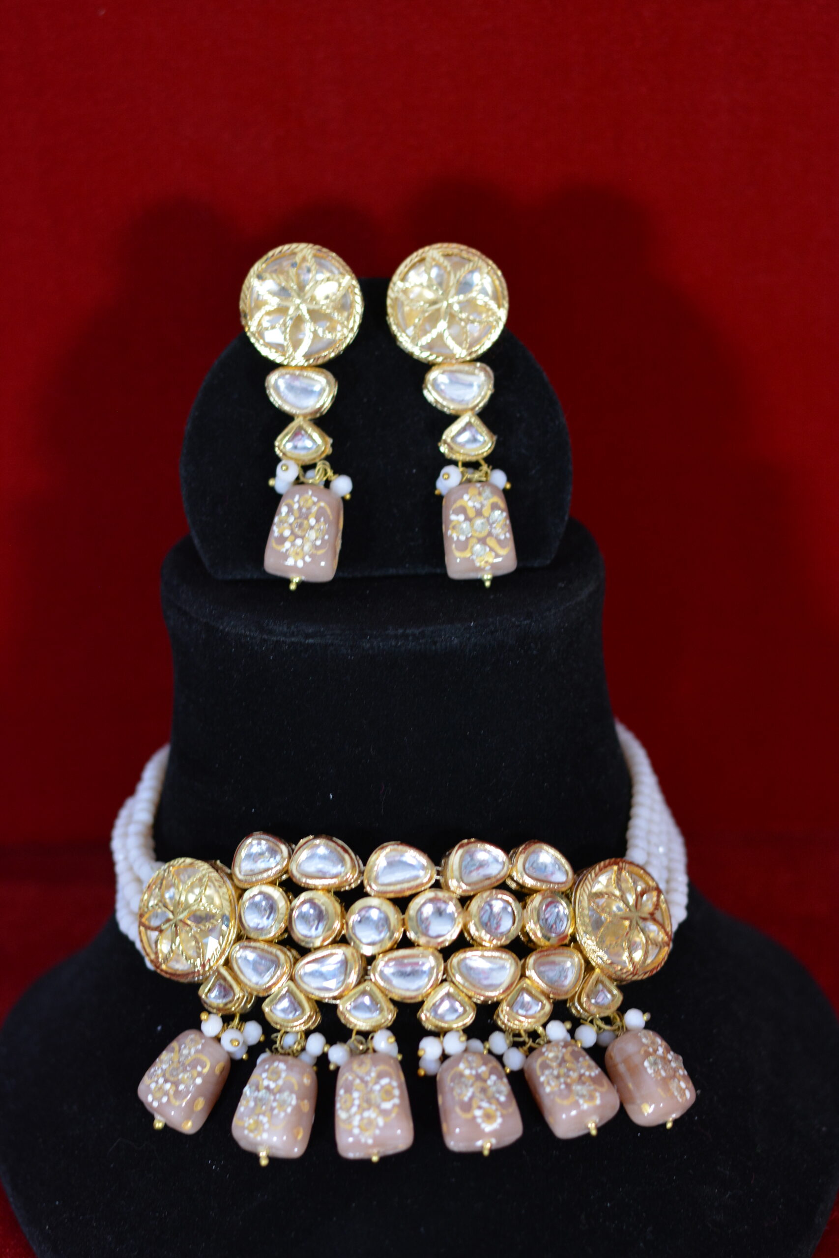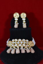 This Handcrafted Kundan Choker Set showcases elegant beige drops paired with luminous Kundan stones and refined gold polish. The soft color palette adds sophistication, making it perfect for bridal wear and festive outfits while delivering a high-end look that remains comfortable, wearable, and affordably priced.