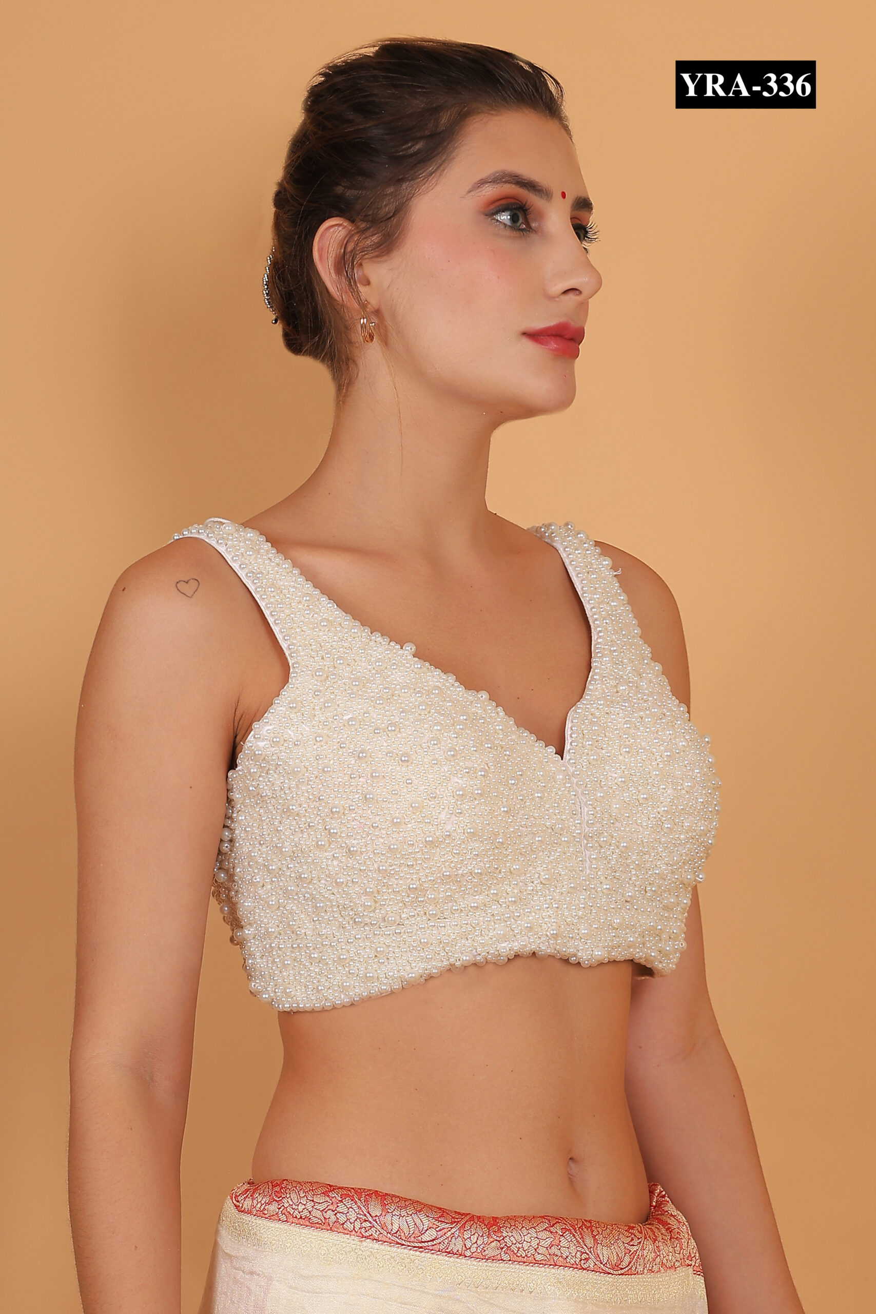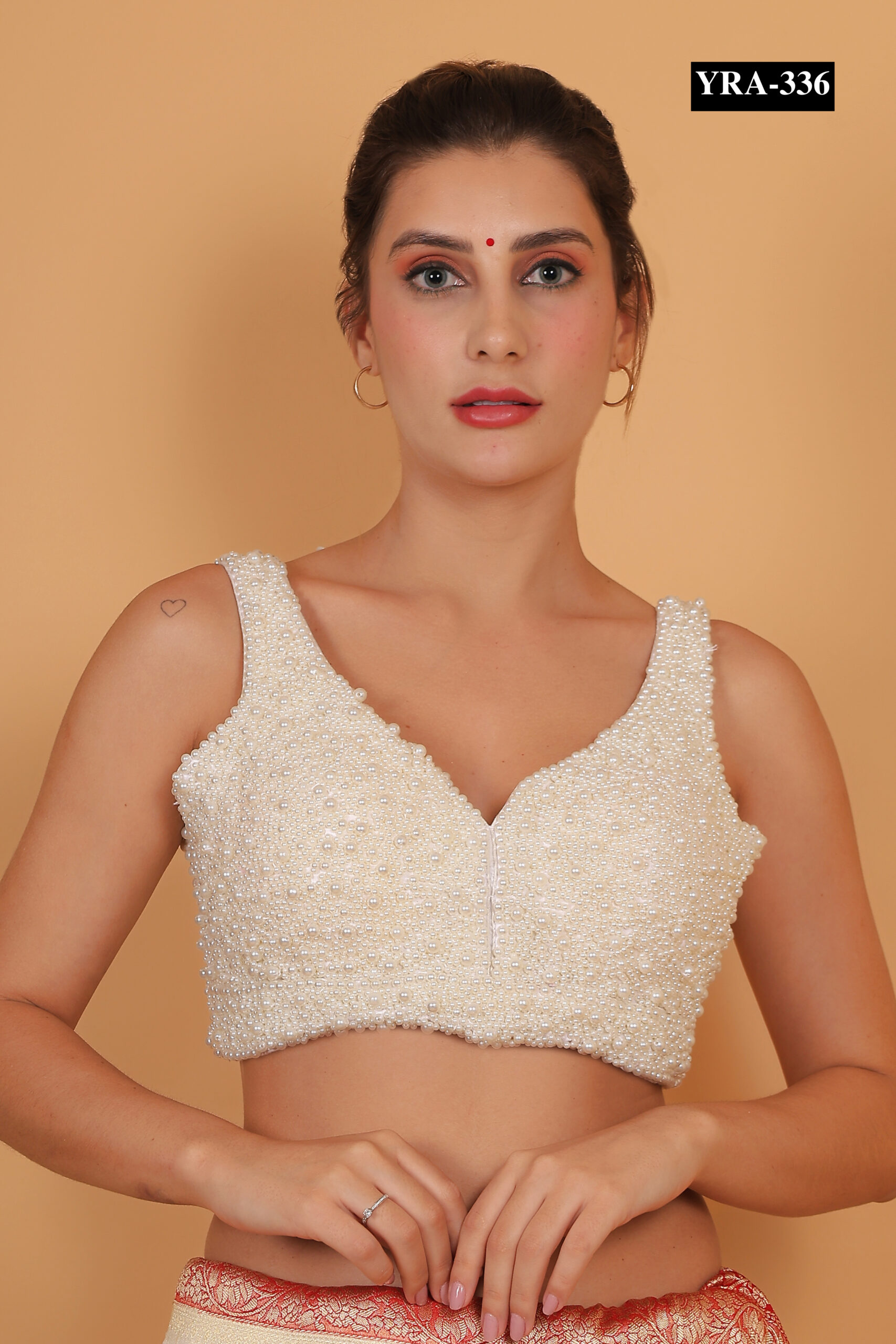 Crafted from premium, breathable fabric, the blouse ensures all-day comfort without compromising on style. The pearl detailing adds subtle shimmer and luxury, creating a blouse that looks both timeless and contemporary. Its versatile design pairs beautifully with sarees, lehengas, or fusion outfits, making it a wardrobe essential for fashion-forward women.